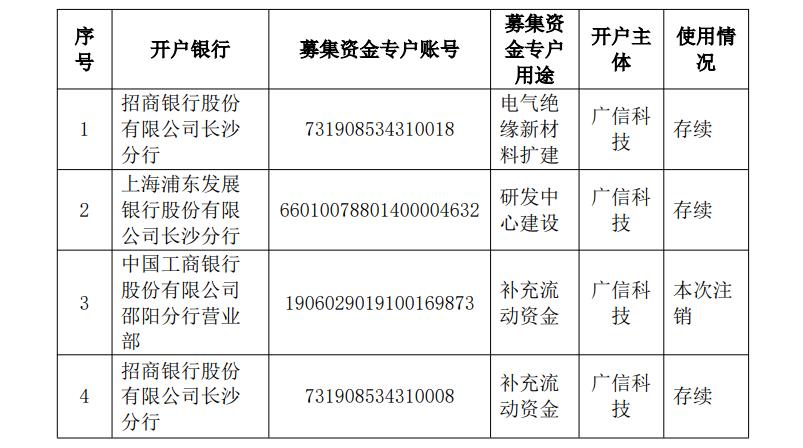 湖南广信科技股份有限公司(以下简称“公司”)向不特定合格投资者公开发行股票并在北京证券交易所上市申请已于2025年4月23日经北京证券交易所上市委员会审核同意,并于2025年5月20日获得中国证券监督管理委员会(以下简称“中国证监会”)出具的《关于同意湖南广信科技股份有限公司向不特定合格投资者公开发行股票注册的批复》(证监许可〔2025〕1078号)。公司本次向不特定合格投资者发行股票2,300.00万股(超额配售选择权行使后),每股发行价格为人民币10元,募集资金总额为人民币230,000,000.00元(超额配售选择权行使后),扣除不含税的发行费用人民币31,139,622.65元(超额配售选择权行使后),募集资金净额为人民币198,860,377.35元(超额配售选择权行使后)。募集资金已分别于2025年6月19日、2025年7月28日划至公司指定账户。上述募集资金到位情况已经天健会计师事务所(特殊普通合伙)验资,并出具了《验资报告》(天健验〔2025〕2-6号)、(天健验〔2025〕2-12号)。
