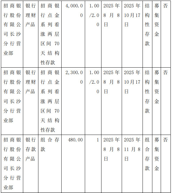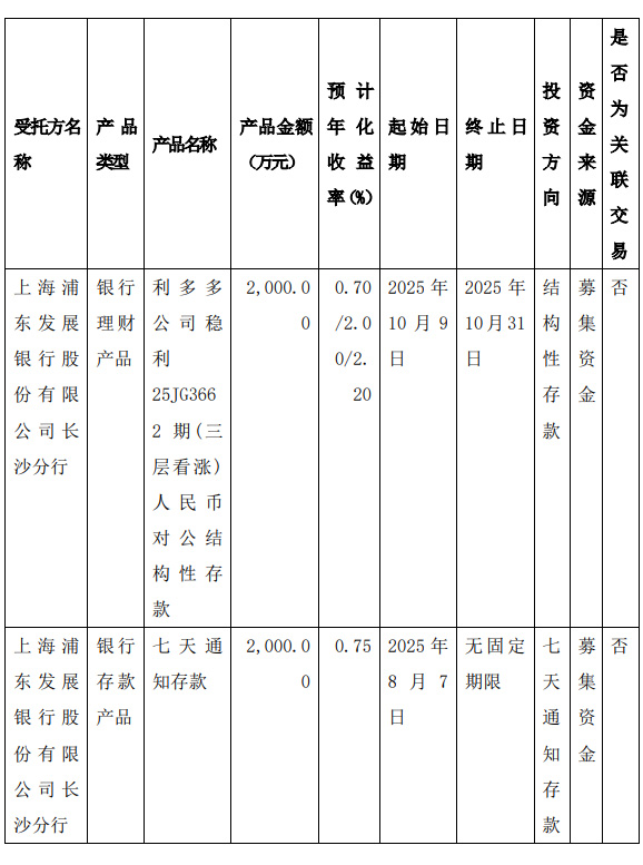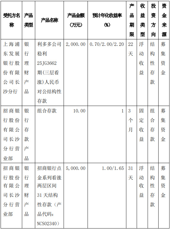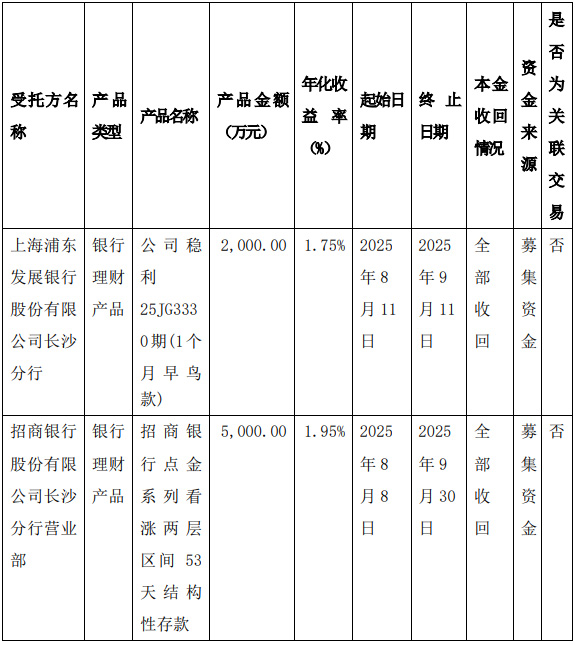 1.本次现金管理产品受托方为上海浦东发展银行股份有限公司长沙分行、招商银行股份有限公司长沙分行,公司董事会已对受托方的基本情况、信用情况及其交易履约能力等进行了必要的调查,受托方信用情况良好,具备交易履约能力。2.本次现金管理不构成关联交易。
