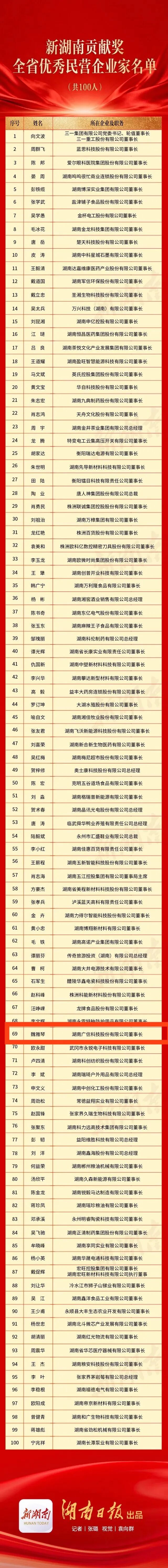 “十四五”以来,面对复杂多变的内外部环境、艰巨繁重的改革发展稳定任务,全省广大民营企业家在以习近平同志为核心的党中央坚强领导下,坚定拥护“两个确立”、坚决做到“两个维护”,自觉投身构建新发展格局、推动高质量发展的伟大实践,在推动科技创新、培育新质生产力、建设现代化产业体系、推进乡村全面振兴、促进区域协调发展、保障和改善民生等方面作出重要贡献。其中,涌现出一批胸怀报国志、一心谋发展、守法善经营、先富促共富的杰出代表,他们以自身模范行动和崇高品格,生动诠释了企业家精神的时代内涵,充分展现了湖南民营企业家的创新风采。为表彰他们的突出贡献,进一步凝聚起比学赶超、团结奋进的强大力量,省委、省人民政府决定,授予向文波等100人新湖南贡献奖全省优秀民营企业家的称号。