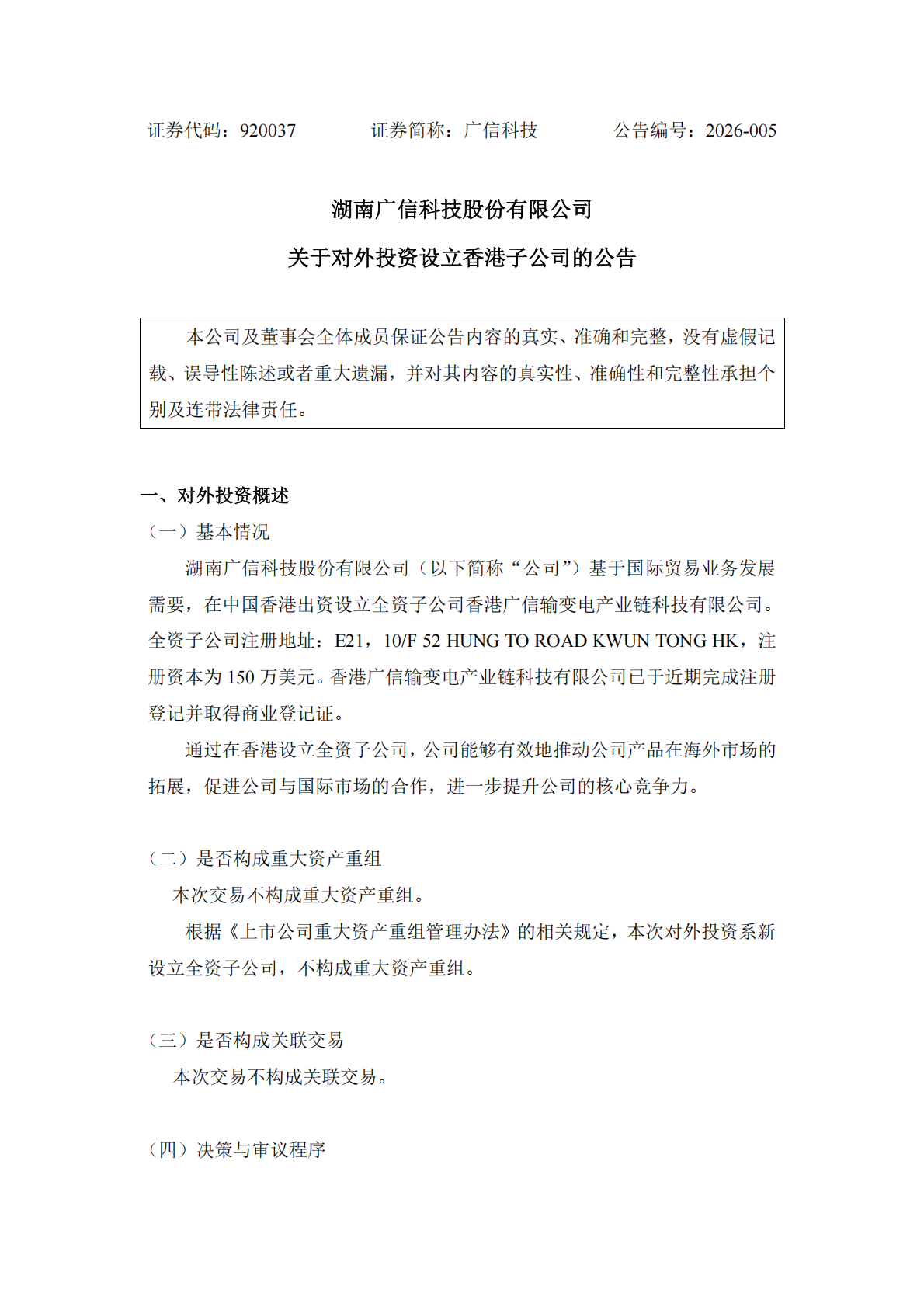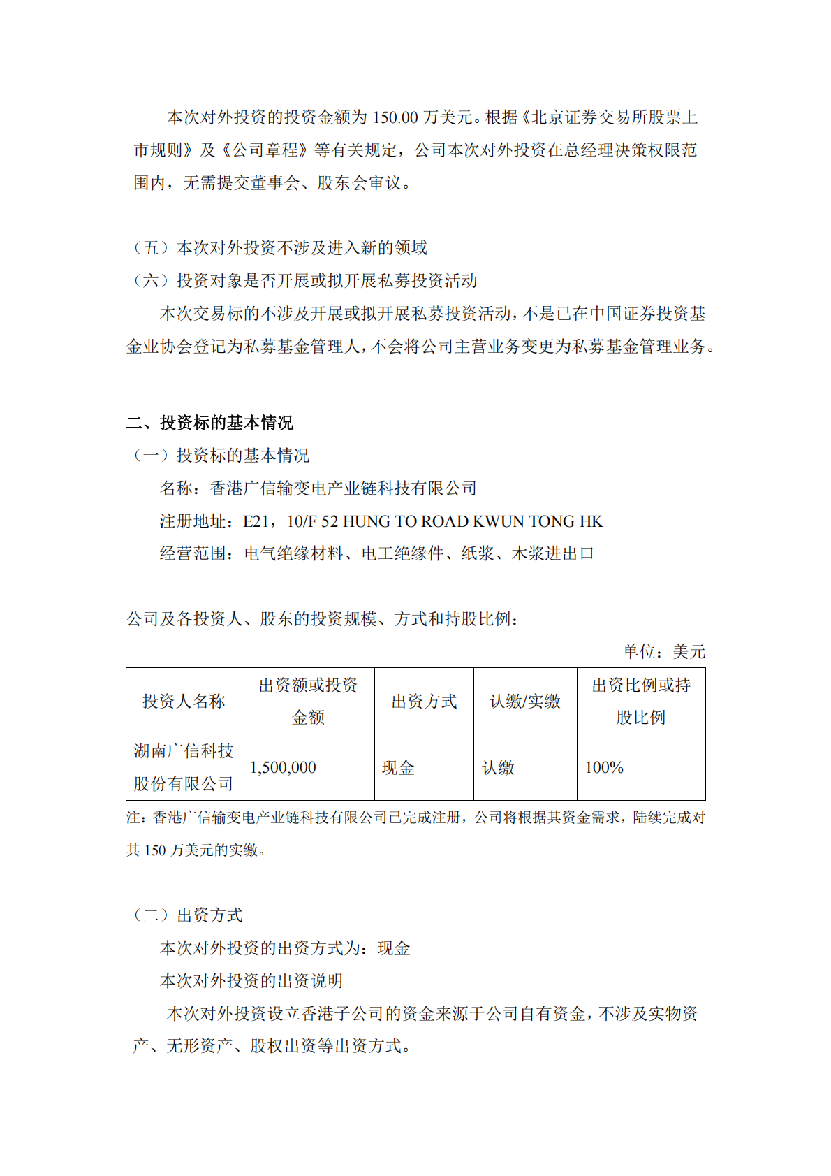 关于对外投资设立香港子公司的公告